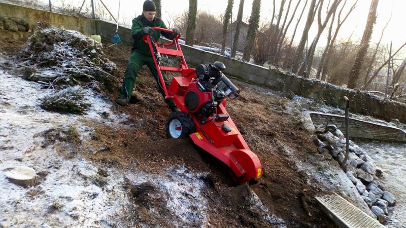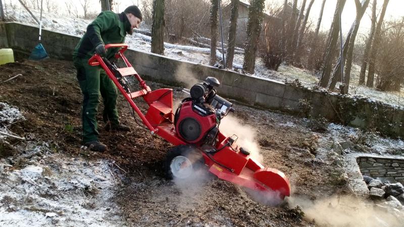 Mit unserer von Hand geführten Wurzelstockfräse können wir den Wurzelstock professionell ausfräsen und den Baumstumpf so entfernen. Mit ihrer Durchfahrtsbreite von nur 80 cm passt die Fräse bequem durch jedes Gartentor.